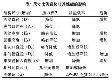 旋風(fēng)除塵器的各個部件都有一定的尺寸比例,每一個比例關(guān)系的變動,都能影響旋風(fēng)除塵器的效率和壓力損失。其中除塵器直徑、進(jìn)氣口尺寸、排氣管直徑為主要影響因素。它們的變化對除塵器性能的影響關(guān)系見表1。在使用時應(yīng)注意,表1中所示的尺寸只能在一定范圍內(nèi)進(jìn)行調(diào)整,當(dāng)超過某一界限時,有利因素也能轉(zhuǎn)化為不利因素。另外,有的因素對于提高除塵效率有利,但卻會增加壓力損失,因而對因素的調(diào)整必須兼顧。
